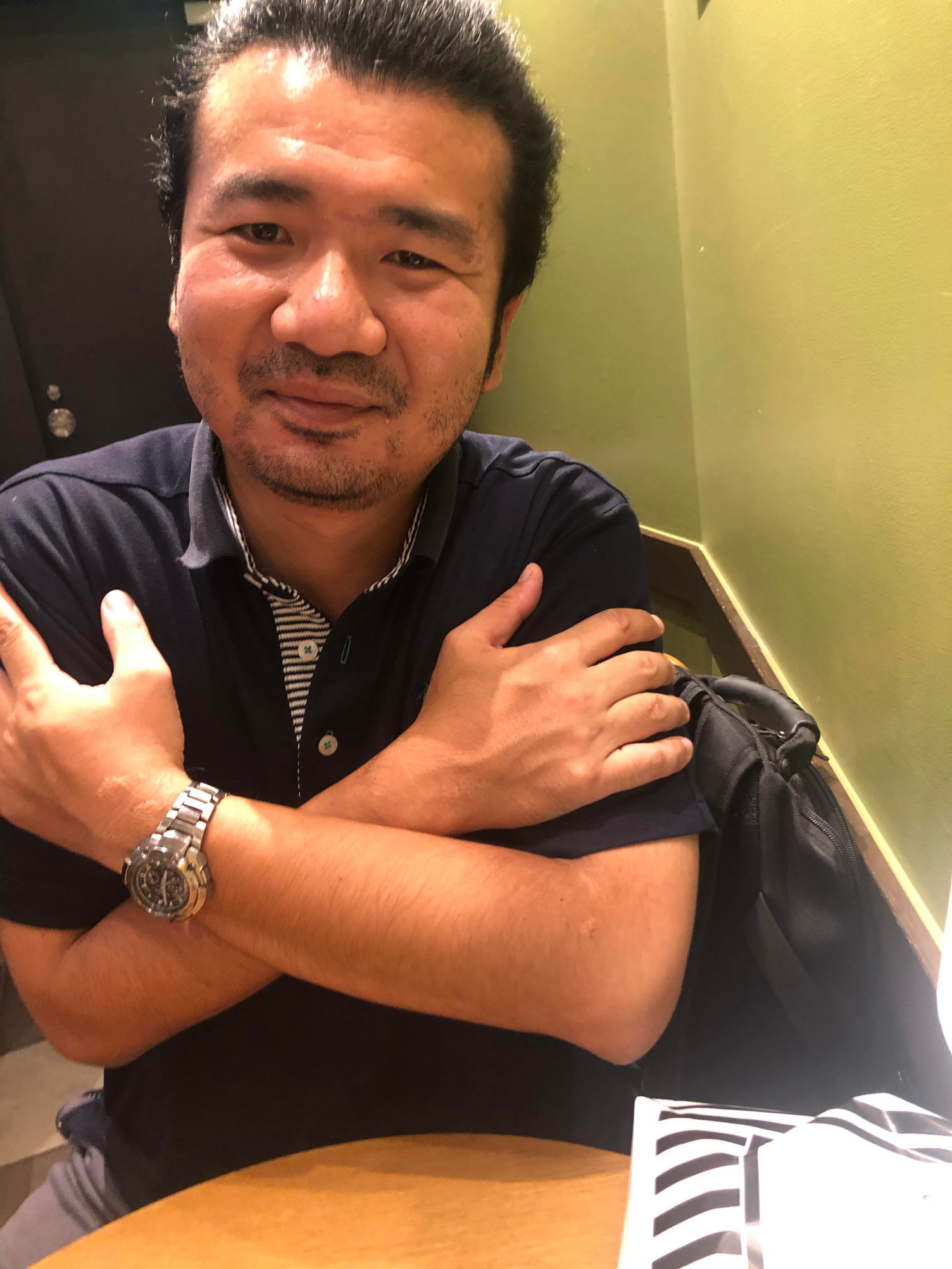 (1)座るか立った状態で、頭頂部を上に伸ばし、肩を広げ大きく深呼吸をして、両手を上に大きく開いて広げてから左右に胸のところで両手をクロスして自分の体を包み込むようにします。